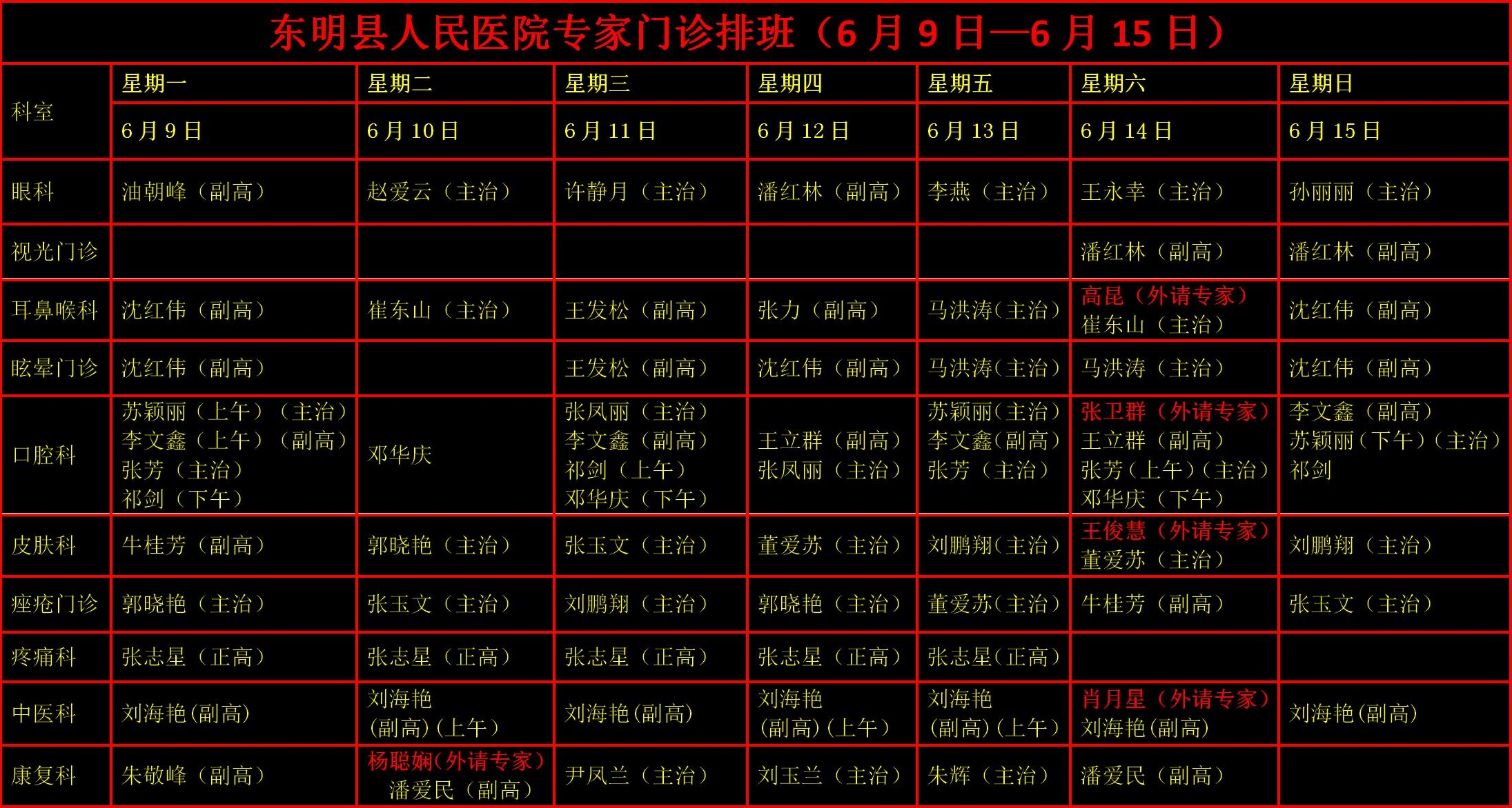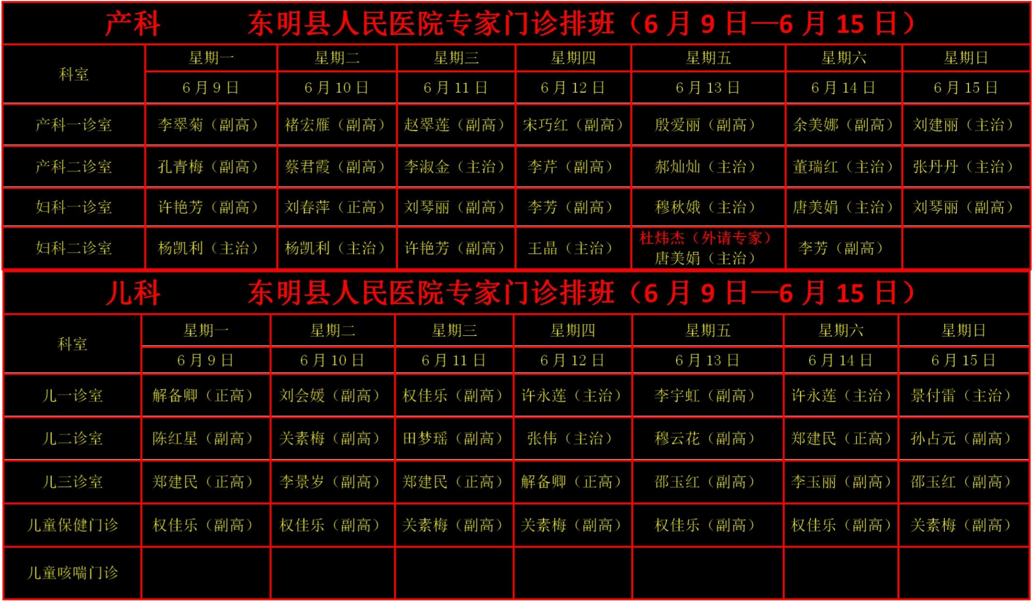 东明县人民医院专家门诊排班(6月9日-6月15日)