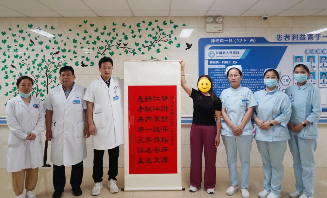 在医患协同努力下,庞奶奶逐步战胜病魔,各项指标趋于稳定,顺利康复出院。为铭记这段“与死神赛跑、以真情守护”的就医经历,家属以字画传递谢意。家属的感谢,既是对神经内一科医护人员专业能力与责任担当的高度认可,更是医患互信、共克病魔的温暖见证,生动映照出科室坚守“以患者为中心”,用医学专业与人文关怀守护生命的医者初心。