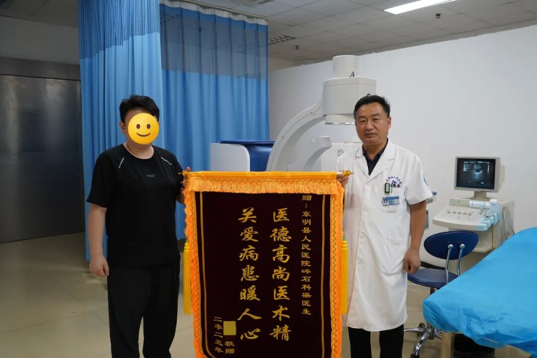 另一边,为放疗科渠海增主任送上锦旗的碎石患者,最难忘的是治疗全程感受到的“安心”。就诊时,患者疼痛难忍、冷汗直冒,家属也急得手足无措。渠主任接诊后,一边迅速安排检查,一边先安抚家属:“别慌,结石碎石技术很成熟,我先和患者沟通一下,让她放松些。”他随即蹲在病床边,用最通俗易懂的语言解释治疗过程:“就像用‘声波小锤子’轻轻敲碎结石,不会疼,有任何不适随时告诉我。”治疗中,他每隔几分钟就轻声询问:“感觉怎么样?有没有哪里不舒服?”;治疗后,担心患者下床不便,特意拿来靠垫,并仔细叮嘱患者:“回去后先吃些软和的食物,如有任何反应,随时给我打电话——这是我的手机号,24小时都能接通。”患者感慨道:“疼时有人递水,紧张时有人宽慰,出院后还能随时咨询,这样的服务比治好病本身更让人铭记终生。”