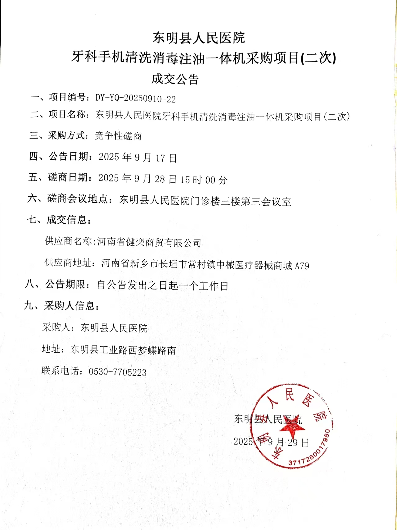 牙科手机清洗消毒注油一体机采购项目(二次)成交公告