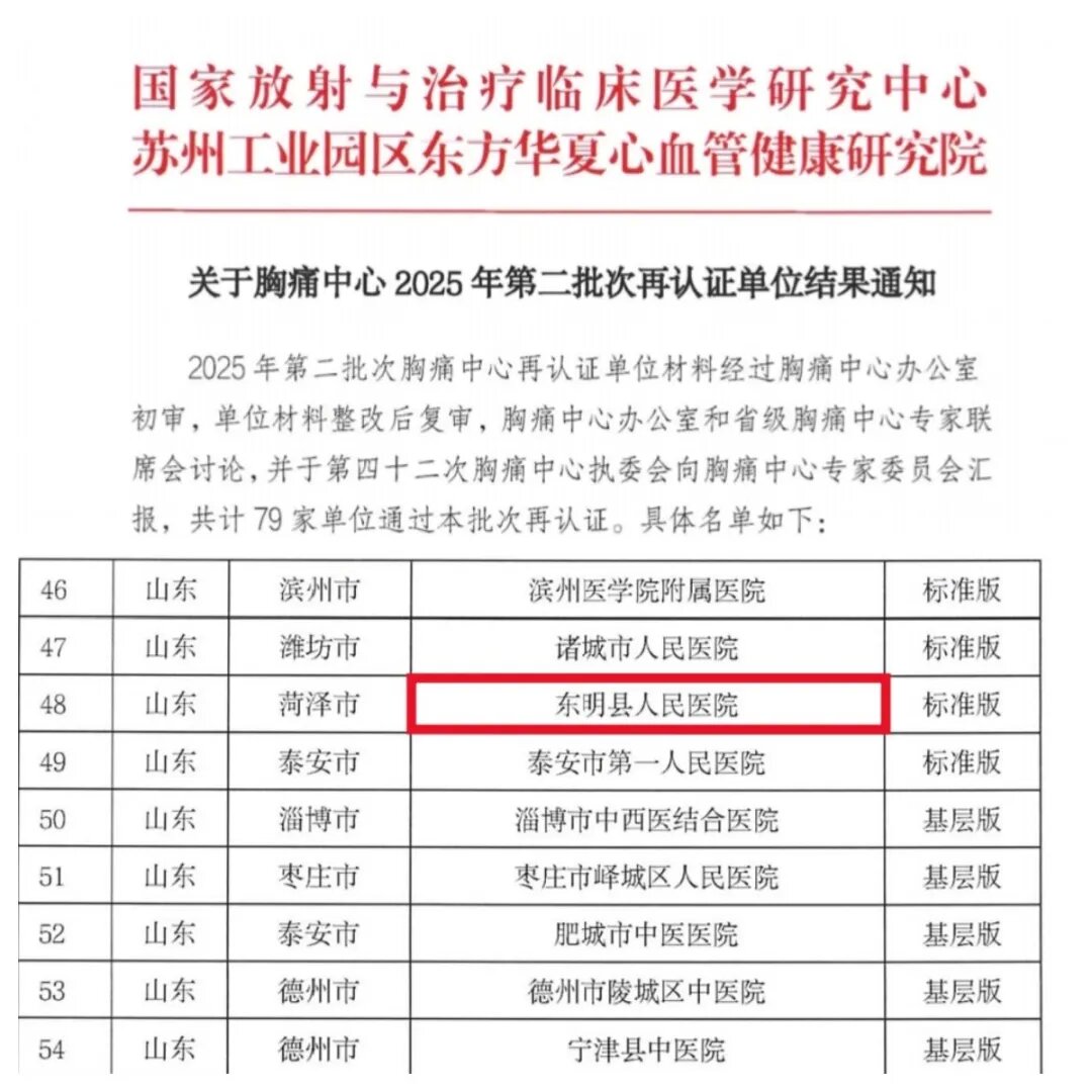 近日,从国家胸痛中心总部传来重磅喜讯:东明县人民医院胸痛中心在全国 383 家参与再认证的医疗单位中脱颖而出,以近乎完美的评审表现,顺利通过 “国家标准版胸痛中心” 再认证。这一荣誉不仅是对医院胸痛中心过往建设成果的权威认可,更标志着医院在急性胸痛救治领域的规范化水平、多学科协作能力与医疗服务质量达到新高度。