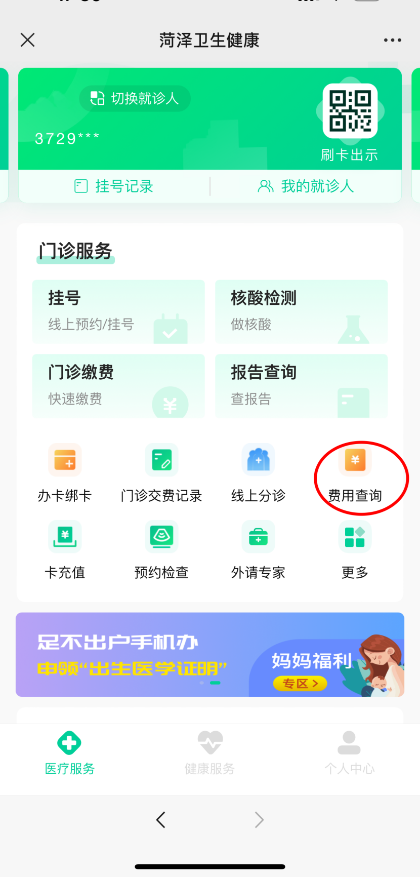 1、微信关注公众号菏泽卫生健康2、进入微信公众号,选择医疗服3、点费用查询4、选择查询时间